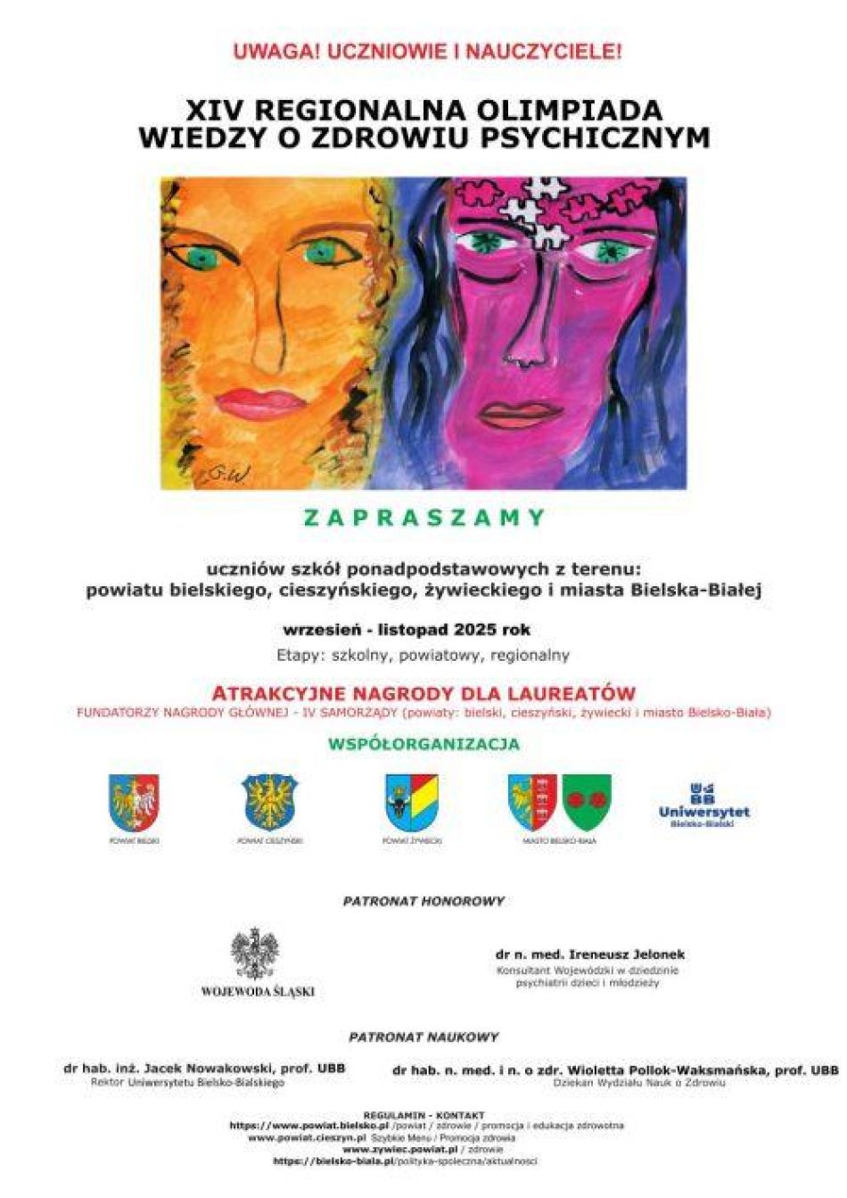 Serdecznie zapraszamy uczniów szkół ponadpodstawowych z terenów: powiatu cieszyńskiego, powiatu bielskiego, powiatu żywieckiego i miasta Bielska-Białej do udziału w XIV Regionalnej Olimpiadzie Wiedzy o Zdrowiu Psychicznym.